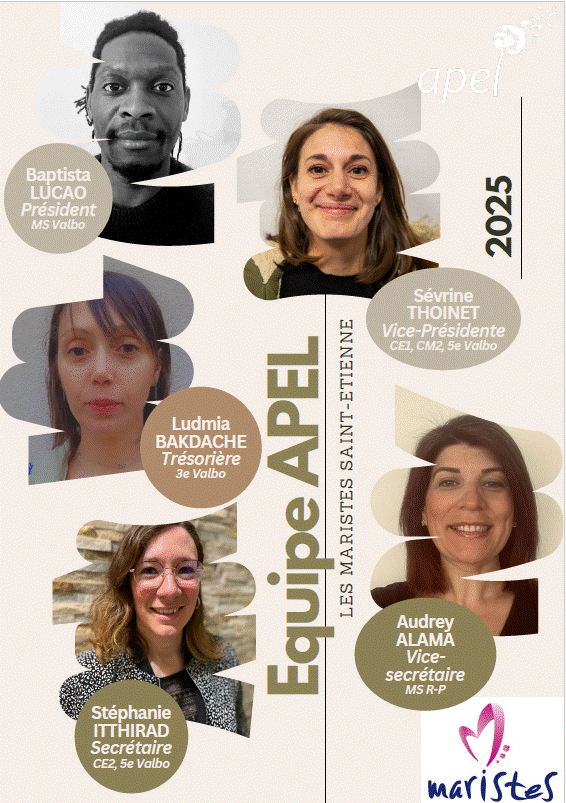 - Les membres du bureau et les membres actifs du CA représentent toutes les familles de l'ensemble scolaire Les Maristes - St Etienne adhérentes à l’APEL.